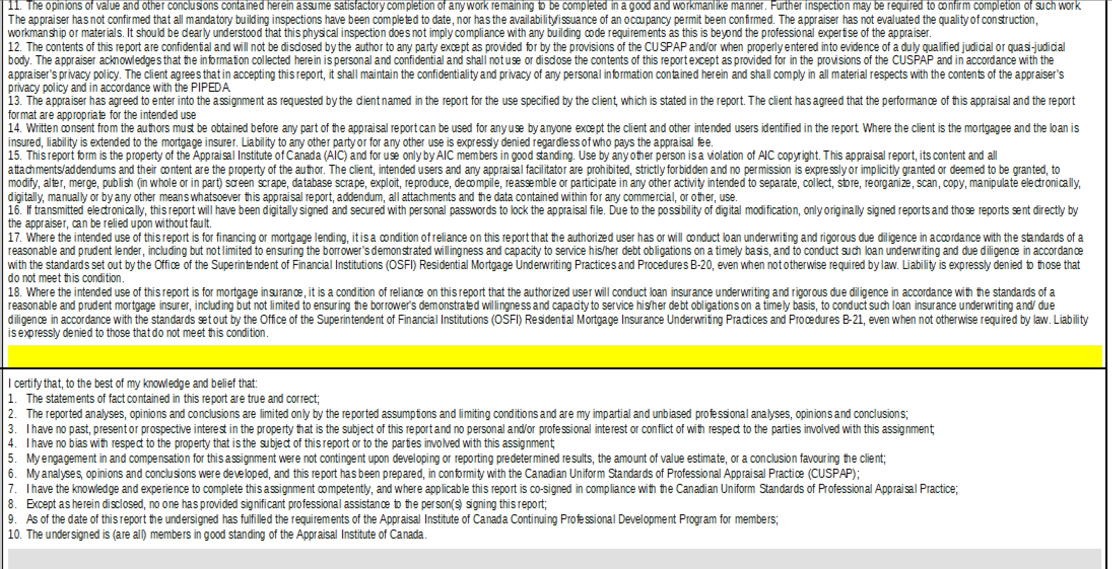 New Appraisal Clause # 17 & #18 added to appraisals. Appraisal Institute of Canada (AIC) in January 2018 requires appraisers to add these two clauses to reports or their E & O insurance will not cover them. All B-Lenders & Private Lenders can no longer rely on the report unless B-20 legislation has been applied to lending.